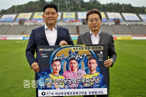 아산무궁화프로축구단은 지난 14일 홈경기에 앞서 ‘O2린’을 생산하는 지역의 대표기업 ㈜맥키스컴퍼니와 ‘아산무궁화프로축구단’ 홍보 보조라벨 전달식을 가졌다.