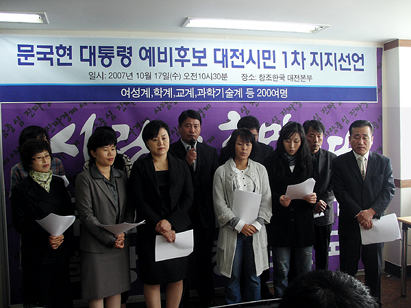 (가칭)창조한국당 문국현 대선 예비후보에 대한 지지세 확산을 위한 대전시민 202명은 17일 오전 용두동 당사에서 문 후보 지지를 선언했다.