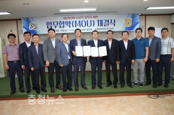 센터에 따르면 18일 센터와 당진시지부는 센터 회의실에서 양측 관계자 등 10여 명이 참석한 가운데 연구개발 기술공유와 농가소득 증대 등을 주요 골자로 한 상호협력 및 교류에 관한 업무협약을 체결했다.