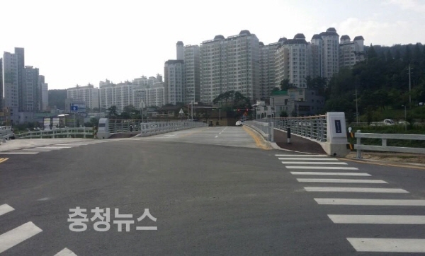시는 지난해 9월 45억원(국비5, 도비5, 시비35)을 투입, 착공에 들어가 총연장 90.4m, 도로폭 15.3m 규모로 교량을 건설하고 설치공사를 성공적으로 마무리했다.