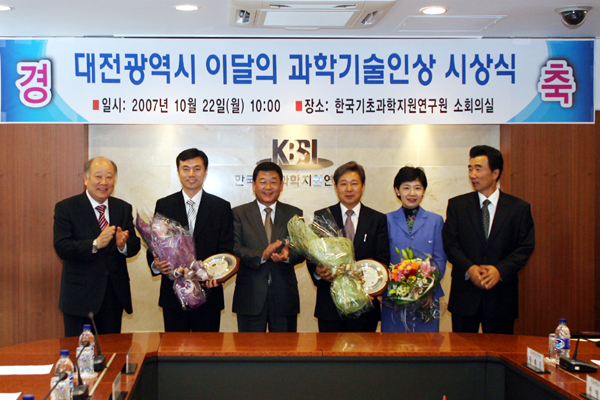 박성효 대전광역시장은 22일 오전 10시 한국기초과학지원연구원 소회의실에서 10월 이달의 과학기술인상 수상자인 한국기초과학지원연구원 전영호책임연구원과 KAIST 김정회 교수에 대한 시상식을 갖고 그 간의 노고를 위로했다.
