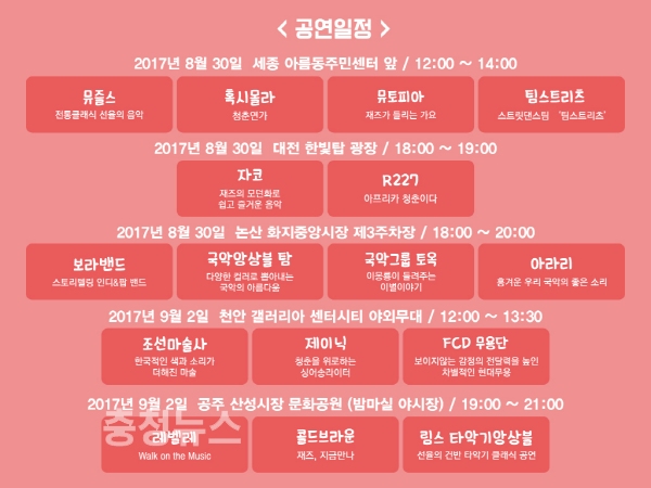 9월 2일 12시부터 천안 갤러리아 센터시티 야외무대에서는 조선마술사, 제이닉, FCD무용단의 공연과 같은 날 19시부터 공주 산성시장 문화공원에서는 레벨레앙상블, 콜드브라운, 림스타악기앙상블 공연이 진행될 예정이다.