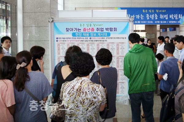 대전 서구(구청장 장종태)가 28일 구청 로비에서 개최한 ‘중년층 취업박람회’에 800여 명의 구직자가 몰려 뜨거운 열기를 보였다.