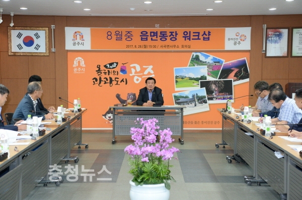 충남 공주시(시장 오시덕)가 지난 28일 사곡면사무소 회의실에서 오시덕 시장을 비롯한 16개 읍면동장과 간부공무원 등 30여명이 참석한 가운데 8월 중 읍·면·동장 워크숍을 개최했다고 밝혔다.