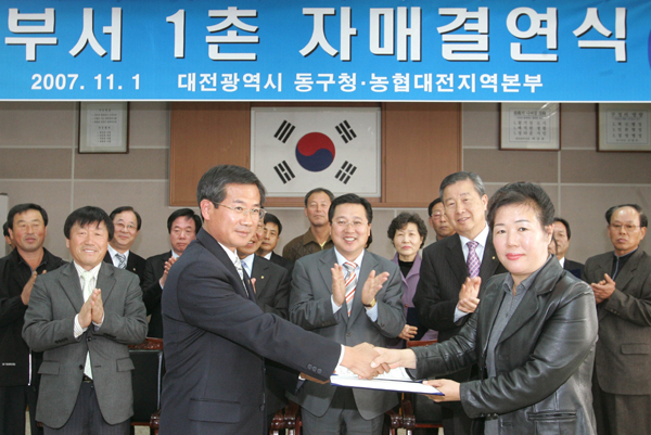 1일, 오전 11시 구대회의실에서 이장우 동구청장을 비롯해 구 9개 희망부서 직원과 관내 삼괴, 효평동 등 9개 마을대표, 농협 관계자 등 30여 명이 참석한 가운데‘자매결연교류협약서’를 체결했다.