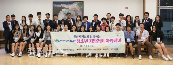 천안아산경실련에서 주관하는 ‘2017 청소년 지방정치 아카데미’에 참여하는 천안아산 소재 고교생 25명은 지난 30일 천안시의회(의장 전종한)를 방문했다. 이번 청소년 지방정치 아카데미는 학생들이 삶과 밀접한 정치를 이해하고 직접 견학 및 토의, 토론을 통해 지방정치의 참여도를 높이기 위해 마련되었다.