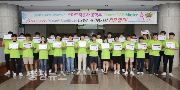 선문대학교(총장 황선조) 스마트자동차공학부 새내기들이 솔리드웍스 국제인증시험 ‘CSWA’에 전원 합격했다.