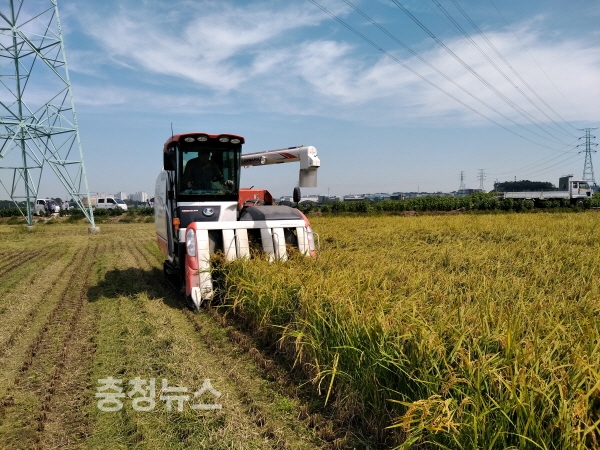 충남 아산시 둔포면 산전리 이대희 (58세, 둔포면 이장협의회장)농가에서 지난 4일 관내에서 첫 벼 베기를 실시했다.