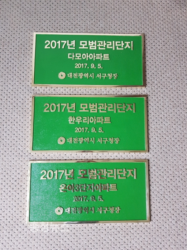 대전시 서구(구청장 장종태)는 2017년 공동주택 모범관리단지로 한우리아파트, 은아3단지아파트, 다모아아파트를 선정하고, 5일 인증 동판을 전달했다.