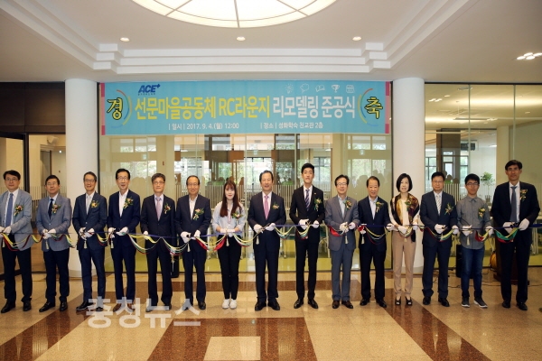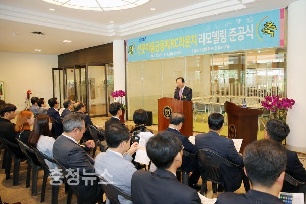 선문대학교(총장 황선조)는 지난 4일 성화학숙(기숙사) 친교관에서 황선조 총장, 박정훈 총학생회장을 비롯한 교직원, 학생, 기업관계자 등 200여 명이 참석한 가운데 ‘친교관 선문 마을공동체 RC라운지 구축공사’ 준공식을 개최했다.