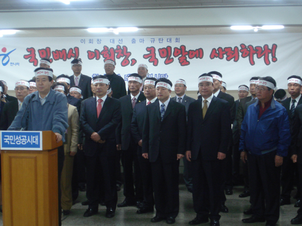 하나.  이회창 대선출마자의 세 번째 대선 출마는 한나라당을 지지하고 정권교체를 열망하는 국민들을 극도의 불안 속으로 몰아놓고 혼란을 초래하고 있는 만큼 지금 당장 국민 앞에 출마 선언을 철회하라.