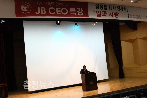 중부대 2017학년도 제2학기 JB CEO 특강의 첫 강사로 나선 염 전 시장은 사람이 왜 일을 해야 하는 문제에 대해 “꿈꾸고, 사랑하고, 열렬히 행하고, 성공하기 위하여”라는 미국의 베스트셀러 작가인 사이먼 사이넥이 한 말을 소개했다.