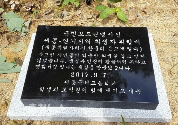 세종국제고등학교(교장 소은주)가 7일 세종시 한울리 은고개에서 ‘국민보도연맹사건 세종-연기지역 희생자 위령비 제막식’을 개최했다.
