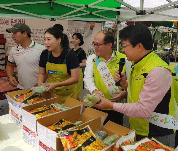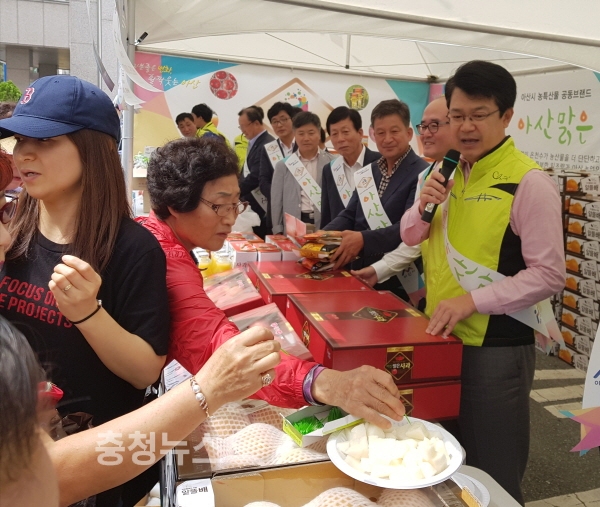 농협 충남지역본부(본부장 유찬형)는 아산시(시장 복기왕)와 함께 8일 충남농협 직거래 금요장터內(대전 대사동)에서 지역에서 생산된 우수농산물을 홍보·판촉하는 ‘아산시의 날’을 준비하여 ‘아산맑은’ 농·특산물에 대한 홍보· 판촉행사를 펼쳤다.