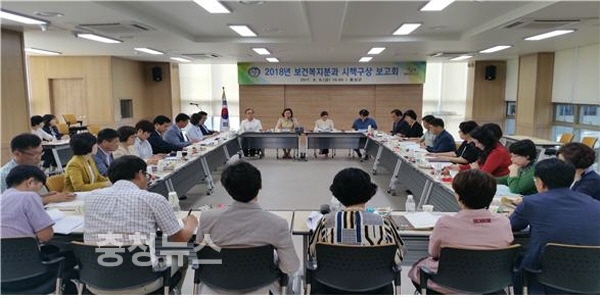 충남 홍성군은 새 정부 복지정책과제에 능동적으로 대처하기 위하여 지난 8일 홍성읍사무소 회의실에서 2018년 보건복지분과 시책구상보고회를 실․과․사업소장 및 자문위원 등 40명이 참석한 가운데 개최했다.