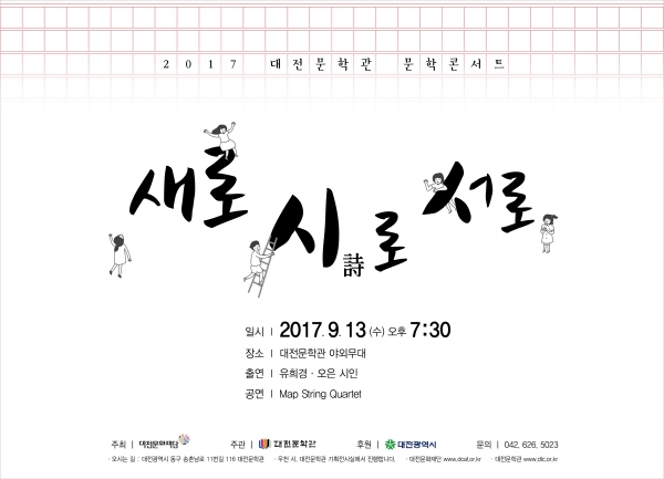 대전문화재단(대표이사 이춘아)이 운영하는 대전문학관(관장 강태근)은 이달 13일 대전문학관 야외무대에서 유희경 시인, 오은 시인 초청 문학콘서트 ‘새로 시(詩)로 서로’를 개최한다.