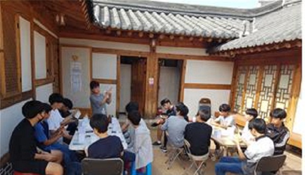 공주한옥마을 일일캠프 참가 청소년 대상 배례법 교육.