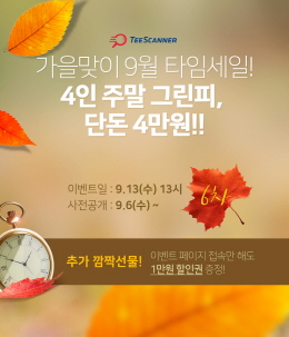 이와 더불어 ‘티스캐너’ 앱의 이벤트 페이지에 접속한 모든 이에게 그린피 1만원 할인 쿠폰도 제공한다. 하지만 6차 타임세일 이벤트가 진행되는 13일 1시부터 2시까지 접속자에 한해서만 제공되므로 시간 엄수는 필수다.