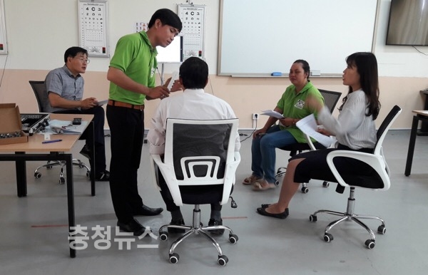 캄보디아 현지 학생들과 안경사 실습을 진행하는 정주현 교수