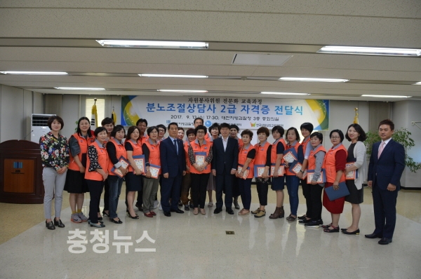 대전지방검찰청(검사장 이상호)과 대전범죄피해자지원센터(이사장 이두식)는 13일 대전지방검찰청 3층 중회의실에서, 대전범죄피해자지원센터 자원봉사위원의 전문화 교육과정의 일환으로 실시한 분노조절상담사 2급 자격과정 수료자에 대한 자격증 전달식 행사를 가졌다.