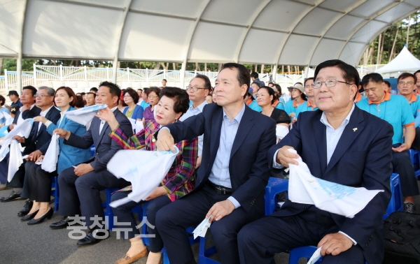 '희망 종이비행기 날리기 '우측으로부터 한상기 군수, 성일종 국회의원, 이용희 군의회 의장
