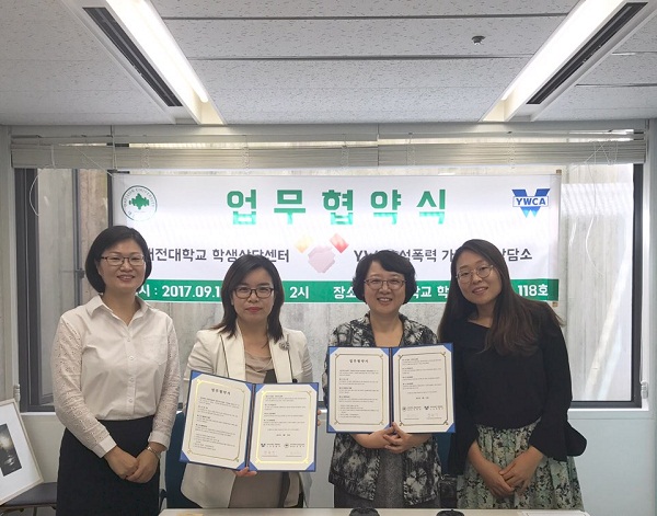 대전대학생상담센터(센터장 윤경아)는 지난 15일 대학 혜화문화관 학생상담센터에서 대전 YWCA성폭력•가정폭력상담소(소장 정현주)와 성폭력 및 가정폭력 피해 학생의 회복을 위한 업무협약(MOU)을 체결했다고 17일 밝혔다.