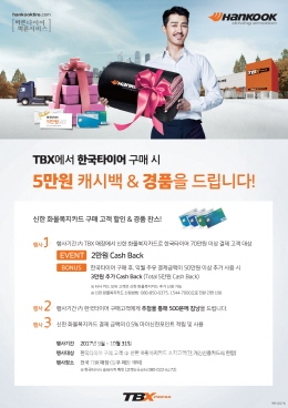 이번 이벤트는 오는 10월 31일까지 전국 한국타이어 트럭·버스 전문매장 TBX(Truck Bus Express)에서 진행되며, 신한 화물복지카드를 보유한 고객이면 누구나 참여 가능하다.