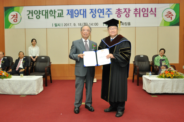정연주 총장은 취임사를 통해 “26년 이라는 짧은 역사에도 건양대가 중부권의 명문사학이 될 수 있었던 이유는 설립자 김희수 박사의 노력과 열정 그리고 건양대 구성원의 헌신, 지역 주민의 사랑과 참여 덕분”이라고 강조했다.