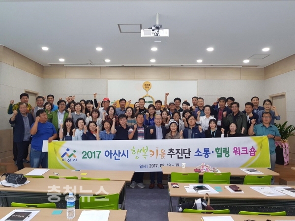 충남 아산시(시장 복기왕)는 지난 18일부터 19일까지 1박 2일간 광주광역시 광산구, 남원시에서 찾아가는 읍면동 복지서비스의 민·관협력 강화를 위한 ‘2017년 행복키움추진단 소통·힐링 워크숍’을 가졌다.