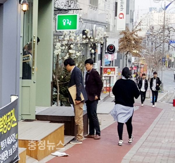 산시 관계자가 불법 공작물 설치한 업소를 방문해 자진 철거를 유도하고 있는 모습