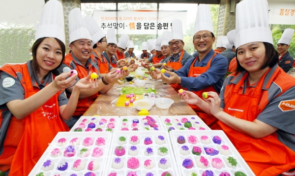 한국타이어(대표이사 서승화)는 20일 충남 금산군 소재 금산공장에서 한국타이어 정진균 금산공장 부공장장을 비롯한 동그라미 봉사단 30여명이 참석한 가운데 송편 나누기 봉사활동을 진행했다.