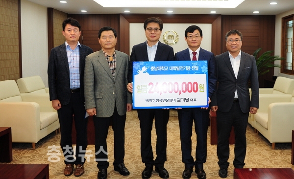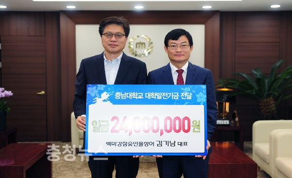 유성구 봉명동에 위치한 백마강참숯민물장어 유성본점이 충남대에 대학발전기금을 전달했다.
