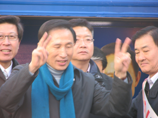 이명박 한나라당 대통령후보는 이날 오전 서울에서 KTX를 이용, 대전역에 도착해 중앙시장상인들과 이재선 시당위원장,이완구 지사,박성효 시장과 오찬을 함께하고  유세장인 으능정이 거리로 이동 했다.