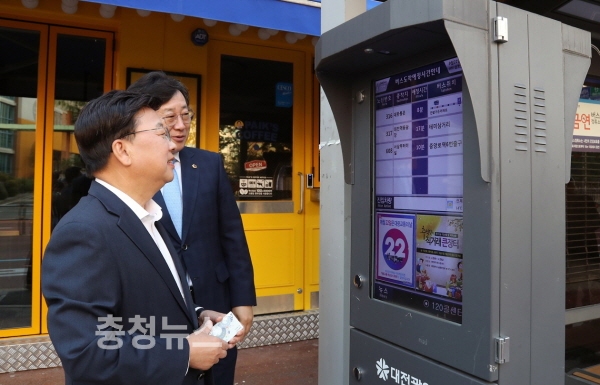 22일 아침 권선택 대전시장이 버스를 이용해 출근하고 있다.