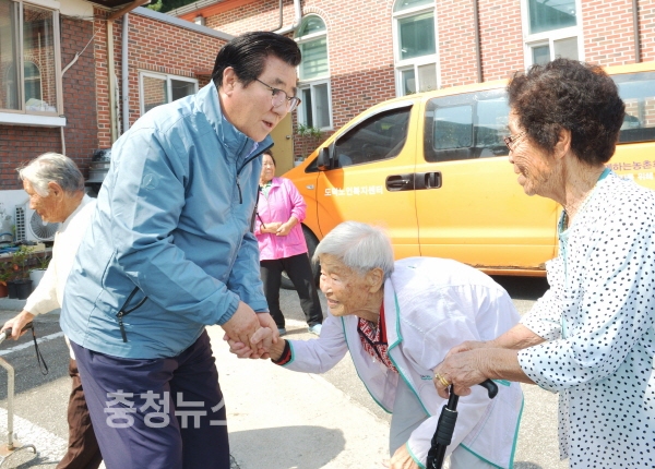 윤석우 충남도의회 의장이 노인복지센터를 찾아 위문하는 모습