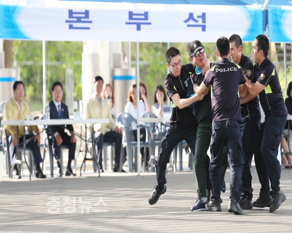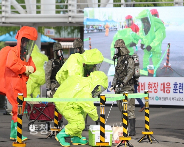 훈련은 엑스포시민광장에 탄저균으로 의심되는 백색 가루를 이용한 생물테러 발생을 가정해 진행됐다.