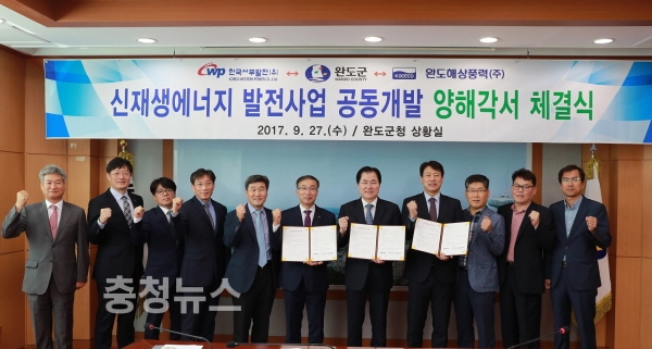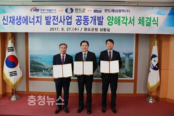서부발전은 27일 전남 완도군 청사에서 완도군(군수 신우철) 및 완도해상풍력(주)(대표 강종식)와 ‘재생에너지 발전사업 공동개발’을 위한 양해각서를 체결했다고 밝혔다.