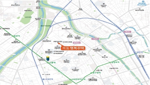 또한 목동 초등학교와 대전선병원, 목동 주민센터가 단지로부터 100m 이내에 있고 인근에 마트 및 버스정류장등이 다수 있어 생활여건이 우수하며, 1km 내 지하철 오룡역, 2km내 KTX 서대전역, 3km내 KTX 대전역이 위치하는 등 대중교통여건이 매우 우수하다.