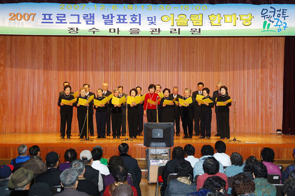 이와함께 어르신들의 장기자랑과 다과 등 어울림 한마당 행사를 벌여 흥을 돋구고 2층 로비에서는 서예교실 작품전시회가 개최되는 등 화합과 축제의 장으로 마련되어, 시설 이용에 따른 애착과 이용자 및 봉사자간 서로의 우정을 돈독히 함으로써 장수마을 발전에 큰 영향을 미칠 것으로 기대된다.