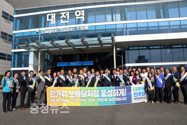 더불어민주당 대전시당은 29일 오후 2시 추석 연휴를 맞아 대전역에서 귀향인사 및 정책홍보물을 배포했다.