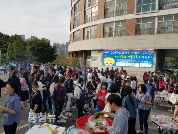 ‘2017년 한가위 유학생 세계문화 어울림 한마당’은 RC교육프로그램으로 긴 추석연휴기간 동안 유학생들이 한국의 명절인 한가위를 경험하고, 정을 나눌 수 있도록 바비큐파티, 추석맞이 사랑의 송편 만들기 체험, 식품과학과에서 교수와 학생이 직접 만든 카스테라 나눔 행사, 추석당일 기숙사 거주학생 무료 식사 제공 등 풍성하게 준비됐다.