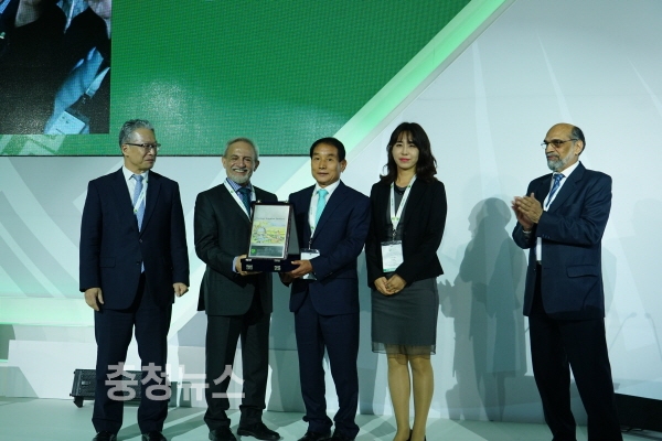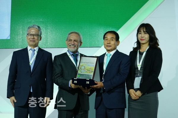 충남 당진 합덕제가 현지시각 이달 10일 오전 11시 멕시코 멕시코시티 월드트레이드센터에서 열린 제23차 국제관개배수위원회(ICID) 세계총회에서 나이리지(Dr. Saeed Nairizi) ICID 회장으로부터 세계관개시설물유산 등재 인증서를 받고 기념촬영을 하고 있다.