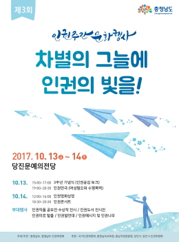충남도는 오는 13일부터 14일까지 이틀간 일 당진 문예의 전당에서 ‘차별의 그늘에 인권의 빛을’을 주제로 ‘제3회 인권주간 문화행사’를 개최한다고 11일 밝혔다.