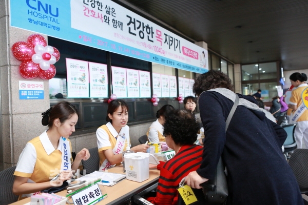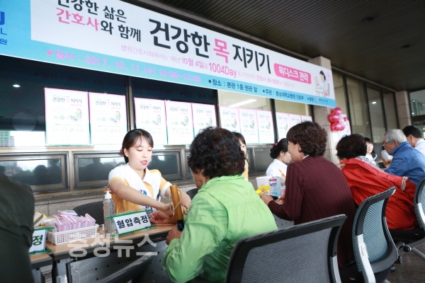 간호사들은 ‘건강한 삶은 간호사와 함께’라는 캠페인으로 환자 및 내원객을 대상으로 건강한 목을 위한 운동요법을 교육하고, 혈압·혈당 측정, 건강상담 등을 진행했으며, 따뜻한 차와 간식 및 기념품(티슈)을 제공해 환자 및 내원객들로부터 큰 호응을 얻었다.