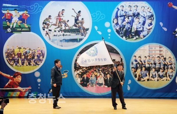 이날 출정식에는 김경훈 의장, 설동호 교육감 등 350여 명의 선수 및 임원이 참가한 가운데 시체육회 임종열 사무처장의 출전보고와 단기수여, 식사 및 격려사, 선수단 선서, 선수단 출정 응원 공연 순으로 진행됐다.