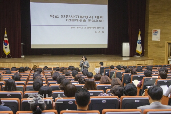 부산 동의대학교 소방방재행정학과 김윤희 교수를 강사로 초빙하여 ‘학교안전과 재난관리’라는 주제로 학교에서의 재난예방과 대처방법을 실질적인 사례를 들어 교육을 실시했다.