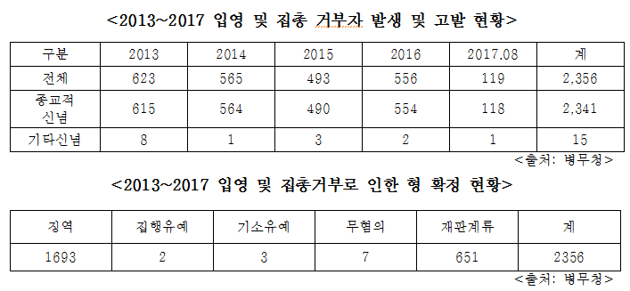 국회 법제사법위원회 박범계 의원(더불어민주당, 대전 서구을)이 헌법재판소와 병무청으로부터 받은 자료를 분석한 결과 최근 5년간 종교 및 기타신념의 이유로 입영 및 집총을 거부한 청년들은 2,356명으로 연 평균 471명에 달하는 것으로 나타났고 이로 인해 최근 5년간 이미 1693명이 실형을 받은 것으로 나타났다.