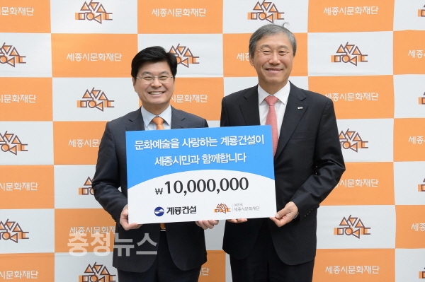 계룡건설(회장 한승구)이 13일 세종시청에서 세종시문화재단(대표이사 인병택)에 문화예술지원금 1천만원을 후원했다.