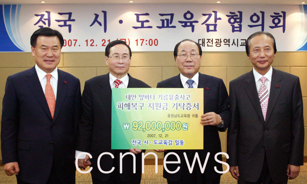 이번 협의회에서는 본호의 시작전 전국시․도교육감들은 지난 충남 태안 앞바다 기름유출사고와 관련해 피해복구 지원금 9천2백만원을 충남교육감(오제직)에게 전달하며 심심한 위로와 함께 조기 정상 복구를 기원하였다.