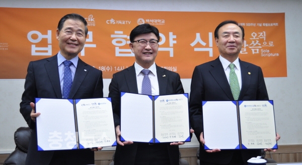백석대학교(총장 장종현)와 한국교회연합(대표회장 정서영), CTS기독교텔레비전(회장 감경철)은 18일 서울 종로구 한국교회연합 회의실에서 교류협력협정을 체결했다.
